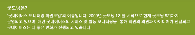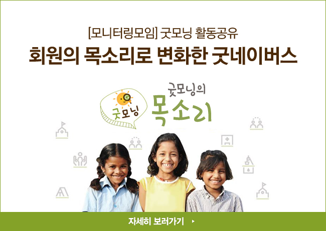 굿모닝 회원님들의 반짝이는 아이디어와 굿네이버스를 향한 애정이 모여 긍정적인 변화를 거듭하고 있는 굿네이버스! 앞으로도 굿네이버스를 향한 회원님들의 목소리가 많이 기대됩니다.