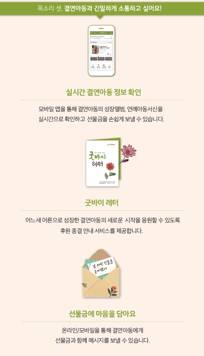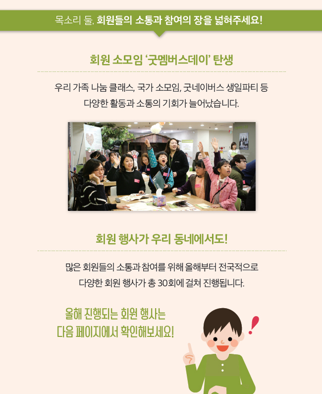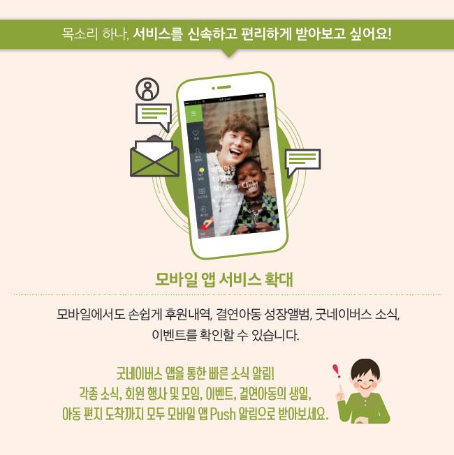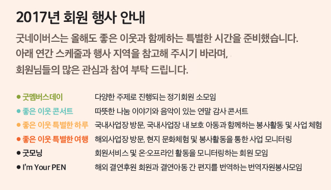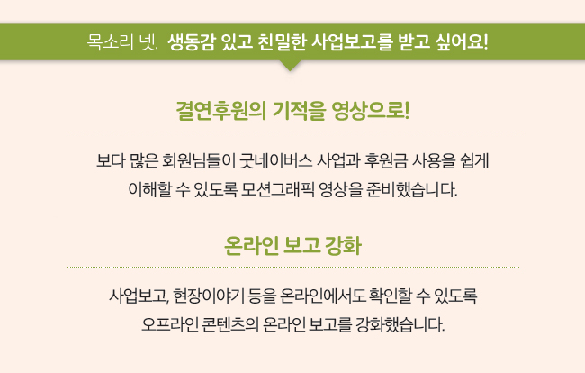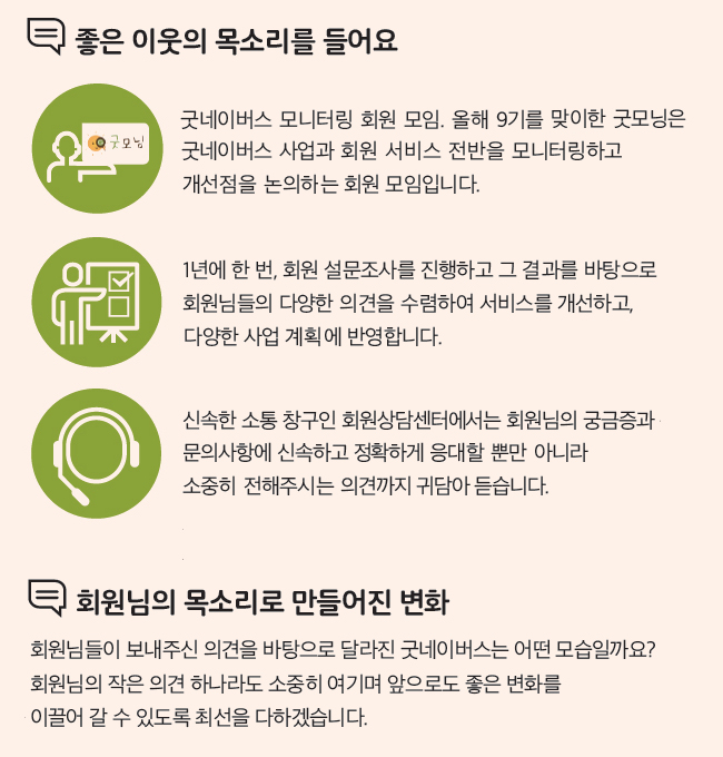 굿네이버스는 회원님들의 다양한 의견에 귀를 기울일 뿐만 아니라, 그 의견을 바탕으로 더 나은 모습을 보여드리고자 노력하고 있습니다. 지난해 회원만족도 조사에 참여해주신 8,400명의 회원님을 비롯해 다양한 창구를 통해 좋은 이웃의 목소리를 듣고 있습니다. 회원님들에게 더 가까이 다가가고 싶은 굿네이버스의 소통 창구와 좋은 변화를 소개합니다. 글