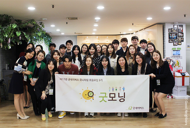 ‘굿네이버스 모니터링 회원모임’의 이름입니다. 2009년 굿모닝 1기를 시작으로 현재 굿모닝 9기까지 운영되고 있으며, 매년 굿네이버스의 서비스 및 활동 모니터링을 통해 회원의 의견과 아이디어가 전달되고 굿네이버스는 더 좋은 변화가 진행되고 있습니다.