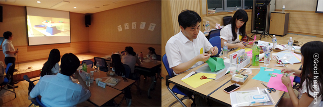 서울동부지부는 내 마음대로 빛의 색깔을 느끼고 만들어 보는 시간을 가졌어요 가족회원들이 참여한 이날의 모임에서는 서로의 빛에 대해 나누고 공감하는 시간을 가졌습니다. 빛의 향연이 펼쳐진 서울동부지부는 심리치료 외에도 학교 네트워크 사업을 통한 후원개발 사업을 활발히 진행하고 있습니다. 기관라운딩과 다양한 질의응답으로 굿네이버스와 회원님이 더욱 친밀해졌습니다. :) 오늘의 하이라이트는 ‘가족치료 프로그램인 LIGHT UP’ 이예요. 바쁜 생활로 자신의 내면을 돌아보기가 힘든 우리 아이들과 부모님은, 먼저 빛 속에 있는 나를 그려보며 나의 내면에 대해 돌아보는 시간을 가졌습니다. 색지와 여러 재료들을 활용하여 빛이 반사될 부분과 공개될 부분을 내 마음대로 정한 후 LED 전구를 놓으며 내 마음을 표현해 보았어요. 오렌지 껍질을 이용한 미끄럼틀, 은박지를 이용한 안경, 하트 집, 은박지 액자 등은 모두 우리 아이들의 작품이었는데요. 자신의 생각을 창의적으로 표현하는 자녀들을 보며, 부모님은 자녀들의 마음에 귀 기울이고, 서로를 알아가는 시간을 가졌습니다. 부모님과 자녀들의 원활한 소통을 돕기위해 강사님과의 일대일 상담시간을 통해 부모님과 자녀들이 서로를 더욱 이해할 수 있는 시간을 갖았습니다.