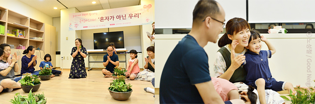 가족들에게 가족을 표현하는 단어를 적을 수 있도록 나무 푯말을 나눠 드리니 함께 머리를 맞대고 우리 가족이 어떤 가족인지에 대한 고민을 하면서 많은 대화를 나누는 모습을 볼 수 있었어요. 푯말을 완성한 가족은 바닥에 놓인 다양한 식물을 자유롭게 선택하여 커다란 도자기화분에 우리 가족만의 디쉬가든을 만들기 시작하였습니다. 자갈과 흙을 손으로 만지면서 가족 간의 교감을 나누었고 식물을 배치하면서 서로의 의견을 자유롭게 나누었습니다. 디쉬가든을 만들면서 하하 호호 가족들의 웃음소리가 가득하였고 행사 시작 전에는 대화가 없던 가족들도 많은 이야기를 나누며 소통하는 모습을 보였습니다. 평소 가족이 가지고 있는 문제를 다른 가족들과 소통하면서 개선할 수 있는 방법에 대해 함께 고민하는 시간을 가진 좋은 이웃들의 모습에 따뜻함을 느낄 수 있었어요:)