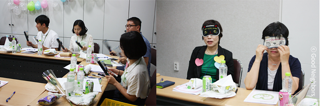샌드위치와 다과가 준비되어 있는 굿멤버스데이! 안양지부에서 준비해주신 대기실은 마치 좋은 레스토랑에 온 기분이였어요:) 정성스런 손길로 마련해주신 다과에 먼저 감동받으며 굿네이버스 사업과 관련된 가로세로퀴즈에 참여하였습니다. 말로만 듣던 VR! 옆방에 설치된 VR존에서 생생한 굿네이버스 해외현장의 사업모습을 영상으로 시청하고 나니 해외에 살고 있는 소외된 또래친구들을 위해 평소 가정 내에서 나눔을 실천할 수 있는 방법에 대해 고민해볼 수 있었어요.