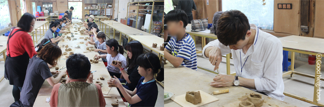 함께 자유시간을 가지며 더 가까워진 좋은 이웃과 짝꿍 아동은 도예 체험장으로 들어가 ‘나만의 도자기’ 만드는 시간을 가졌습니다. 네모였던 찰흙이 각각의 손길이 닿으며 자신만의 개성 넘치는 작품이 되어가는 모습을 보니 정말 신기하고 즐거웠어요. 조물락 조물락 어떤 작품이 나올지 정말 기대가 되네요^^
