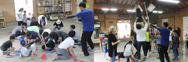 갑자기 내리는 비에 당황스러웠지만 누가 우리를 막을 수 있을까! 도예 체험장 안에서 불타는 승부욕으로 더욱 더 흥미 진진한 레크리에이션 시간! 마음껏 뛰며 게임을 했더니 어느 덧 시간은 훌쩍 흘러버렸네요. 서로 몸과 마음을 맞춰 진행된 팀별 레크레이션으로 더욱 끈끈해졌답니다. 이렇게 좋은 이웃들과 온주푸른교실 지역아동센터 아이들이 함께한 ‘좋은 이웃 특별한 하루’ 프로그램을 마치고 회원들과 아이들이 자연 속에서 힐링이 되는 시간을 가지며 또 하나의 잊지 못할 추억을 만들었습니다.