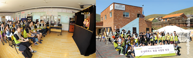 좋은 이웃들이 따뜻한 마음으로 후원해준 회비는 어떻게 사용되고 있을까요? 몽골에 도착한 좋은 이웃들은 가장 궁금했던 굿네이버스의 사업들을 살펴보았어요. 2007년부터 몽골의 수도인 '울란바토르' 칭길테 지역에서 사업을 시작한 굿네이버스 몽골은, 일거리를 찾아 도시로 유입된 유목민들에 의해 조성된 도시빈민가에서 총 6개의 지역개발사업장을 운영하고 있었어요. 각 사업장에서는 교육보호사업, 보건의료사업, 식수위생사업, 소득증대사업을 통해 지역주민과 아동들을 돕고 있었어요. 좋은 이웃들은 실제로 몽골의 초등학교 1~2학년 대상으로 진행되는 ‘성폭력예방 인형극’을 직접 관람하는 시간도 가졌어요. 또 이날 가장 신기했던 것은 ‘G-Saver’. 겨울철 –40°C로 떨어지는 기온으로 대부분의 수익을 난방비로 지출하던 지역주민들에게 굿네이버스 적정기술로 제작된 축열기 G-Saver는 정말 유용해보였어요. 지역 내에 설립된 제조공장도 방문하였답니다. 좋은 이웃들이 나눠준 따뜻한 마음이 아이들과 지역주민의 건강한 삶을 돕고 있어 더욱 뿌듯하고 기뻤습니다.