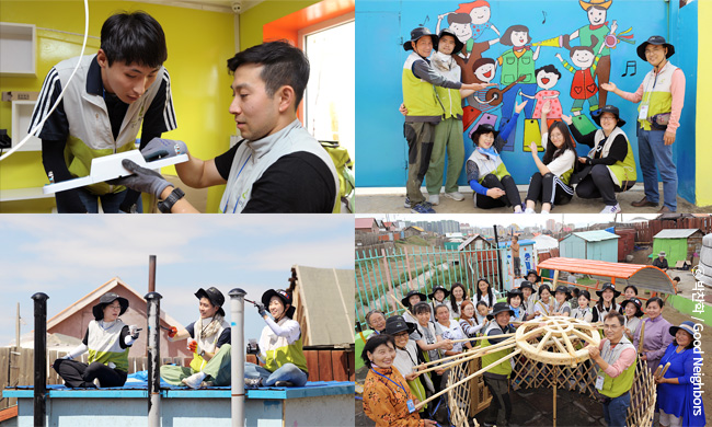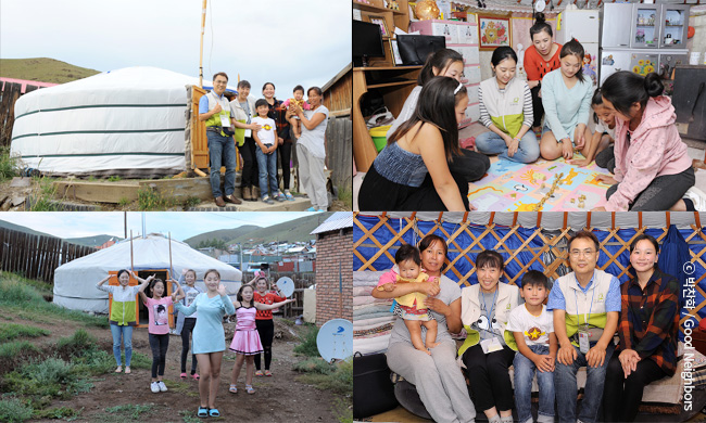 뚝딱! 뚝딱! 성근하이르항 지역개발사업장에서 좋은 이웃들의 연장을 든 손이 쉴 새 없이 움직입니다. 도시 빈민가인 성근하이르항지역 청소년들이 머물고 싶어하는 공간을 선물해주기로 한 것. 또한 성근하이르항, 칭길테 지역개발사업장의 낡고 벗겨진 외벽과 대문에는 굿네이버스 전문봉사자 ‘김윤미 작가’의 일러스트 작품이 좋은 이웃과 아동들 손에서 다시 피어났습니다. 한국의 더위 못지않은 여름 날씨와 먼지 가득한 환경이지만 아동들을 위한 마음만으로 뭉친 좋은 이웃 특공대의 미션은 성공인 듯 합니다. 미션 완료 후 감사 공연을 준비해준 아동들 덕분에 감동 두 배! 지역주민위원들과 함께 몽골의 전통 가옥인 ‘게르’를 만들어보는 특별한 시간도 가졌습니다.
