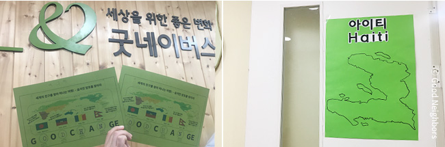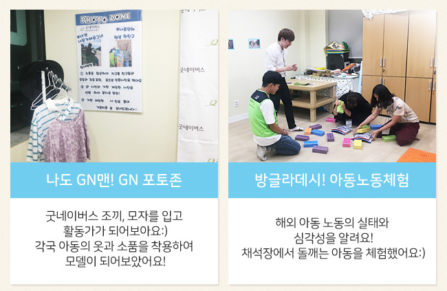 교육실을 나와서 나라별로 꾸며진 부스에 회원님들이 자유롭게 들어가서 활동을 진행하였는데요. 각 부스 앞에는 나라 이름이 적혀있고 각 나라의 아동들이 실제 겪고 있는 상황을 재현하여 직접 체험해보았습니다. 실제 해외 현장에서 적용되는 어려움, 회원들의 나눔을 통해 개선되어진 부분, 그 나라에서 진행되고 있는 굿네이버스의 실제 사업들을 체험을 통해 알아볼 수 있는 시간이었습니다.