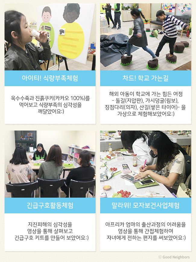 물이 담긴 물통을 머리 위에 이고 지압판을 걷기 체험을 마친 이은주 좋은 이웃은 “‘짧은 거리의 간접 체험이지만 힘들었어요. 해외 아동들은 이 무거운 것을 들고 얼마나 많은 길을 걷고 있을까라는 생각에 마음이 아팠어요.” 라고 소감을 나눠주었습니다. 좋은 이웃님들과 아프리카 엄마의 출산 과정과 환경에 대해 나눠보는 시간은 진지하고 눈물을 보이는 좋은 이웃님들도 있을 만큼 차분한 분위기에서 진행되었어요. 활동지에 작성된 소감과 같이 많은 분들이 아픈 현실에 공감하고 가슴 아파하는 모습을 보여주었습니다.