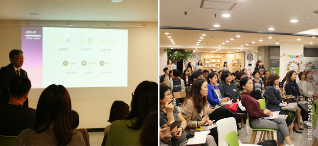 1년 중 8개월이 겨울인 척박한 땅, 몽골에서 굿네이버스를 통해 어떤 좋은 변화들이 어떻게 생겼는지 몽골 지부장님의 생생한 목소리를 통해 들을 수 있었습니다. 몽골에서 진행되는 아동 결연 사업과 사회적기업에 대해 자세히 알게된 좋은 이웃들. 뇌성마비 때문에 세 발자국도 떼기 힘들었던 결연 아동이 굿네이버스를 통해 치료를 받게 된 이야기는 모두의 마음을 뭉클하게 만들었습니다. 내가 후원하는 아동을 더 이해하고 싶어서, 혹은 몽골의 굿네이버스 사업이 궁금해서 모인 좋은 이웃들이 하나라도 놓칠세라 열심히 듣고 계시는 모습 보이시나요?