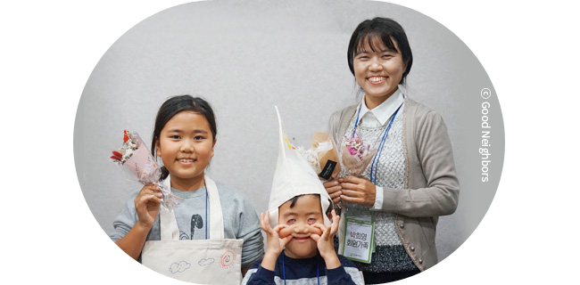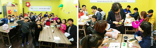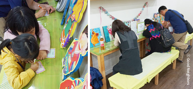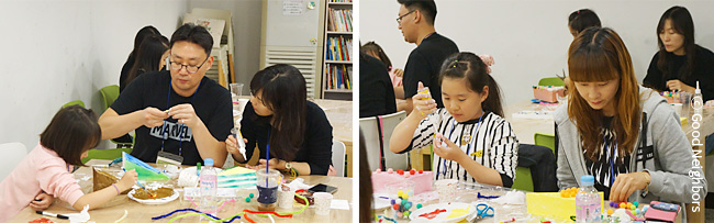 가족이 함께 하는 나눔 활동으로 ‘꿈찌(팔찌)’만들기 활동을 진행했어요. 꿈찌는 아동노동 반대에 동참하는 활동인데요, 좋은 이웃들이 지구촌 아동노동의 영상을 통해 아동노동의 심각성을 인지하고 공감하는 시간이었어요. 또한 방글라데시 사업장에서 직접 만든 실로 열심히 꿈찌 만드는 일에 동참해주었답니다. 예쁜 실로 만든 꿈찌를 팔목에 차고 함께 아동노동 반대활동을 기념하며, 꿈찌에 희망문구를 넣어 가족의 사랑을 표현하였어요.