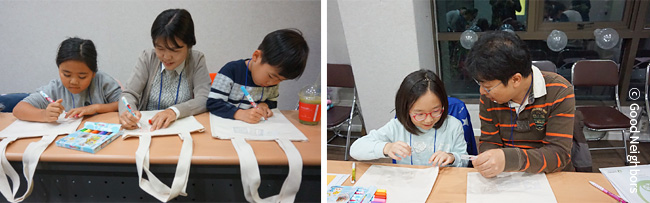 가족들을 격려하는 노래를 부르고 눈을 감고 음악을 감상하며 자신에게 긍정감을 주는 이미지를 떠올려보았어요. 그리고 직접 경험한 긍정 이미지를 에코백에 표현해보았답니다. 기쁨과 행복이 가득 담긴 나만의 에코백을 만들며, 각자 스스로를 돌아보며 가족에 대한 서로의 생각을 알아가는 시간을 가질 수 있었습니다. 자신이 직접 만든 에코백을 들고 즐겁게 집을 나설 모습을 상상하며 프로그램이 끝나기 직전까지 열정적으로 에코백을 꾸미고 만들었답니다.