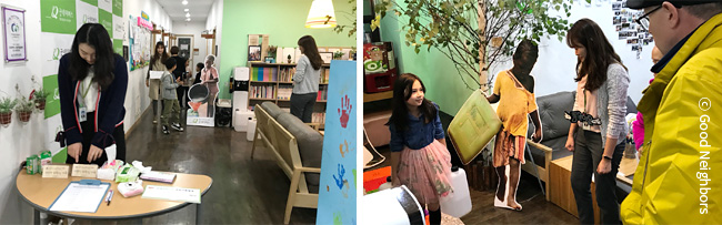 좋은 이웃 가족들은 입구부터 단계별 미션을 수행하면서 이동하였는데요. ‘STEP1, 나눔 스케치북에 나의 흔적 남기기’, ‘STEP2, 생생한 나눔증서 촬영하기’를 통해 준비된 포토존에서 다양한 소품과 함께 인증사진을 찍었어요. 또한 ‘STEP3, 나만의 나눔명언 작성하기’ 활동으로 우리가족이 생각하는 나눔에 대해 알게 되었어요. 마지막, ‘STEP4, 좋은마음센터 한바퀴’ 활동으로 센터 라운딩 후 집단활동실로 이동!! 준비된 저녁식사와 다과를 즐기며 본 프로그램 시작을 즐거운 마음으로 기다렸습니다.