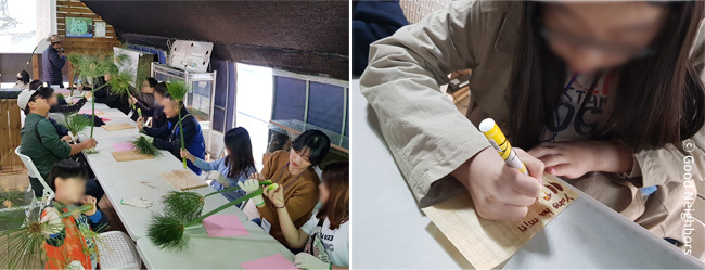 조금 더 가까워진 좋은 이웃과 짝꿍 아동은 파피루스를 흔들며 장난도 치고, 조심스레 얇게 자르며 어떤 종이가 만들어 지는지 반짝반짝 반짝이는 눈으로 기다려봅니다. 만들어 놓은 파피루스 종이 위에 상형문자로 집중하며 자신의 이름을 작성 후 동그란 테두리를 두르고는 멋쩍은 웃음 지으며 함께 활동을 합니다.