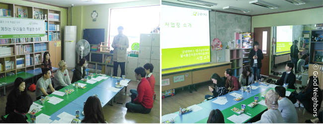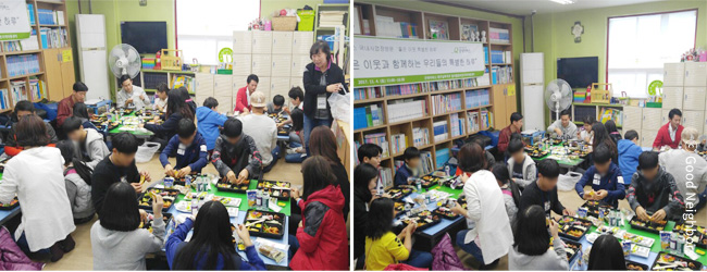 좋은 이웃과 함께하기에 지역아동센터 아이들의 점심은 더욱 특별합니다. 처음엔 살짝 긴장하였지만 아이들을 만나고 나서는 이내 행복한 미소를 지으시며 엄마, 아빠의 마음으로 함께 밥먹는 모습이 너무 다정해보이네요:)