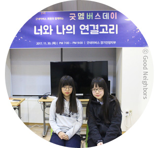 저는 안양부흥초등학교 6학년 고연서이고, 학교에서 희망편지쓰기대회에 참여하여 나눔을 실천하고 싶어서 부모님과 상의 후 해외아동결연을 시작하게 되었어요. 제가 후원하는 단체인 굿네이버스에 대해 더 알고 싶은 마음이 있었는데 지역사회 내에서 회원이 참여할 수 있는 기회가 있다고해서 참여하게 되었어요. 음악프로그램으로 진행하다보니 너무 즐거웠고 심리치료라는 것을 간접적으로 느낄 수 있어서 너무 좋았어요. 굿네이버스에 여러 사업장이 있다는 것도 알게 되었고 경기안양지부에서 하는 일이 무엇인지 알 수 있었어요. 다음에는 가족 모두와 함께 참여하고 싶습니다. 나눔은 단순히 생각하면 굉장히 쉬운 것이지만 실천하는 것이 어렵기에 많은 사람들이 고민하고 실천하지 못하는 것 같아요. 저는 크게 생각하지 않고 작은 일부터 실천하는 것이 나눔이라고 생각해요.