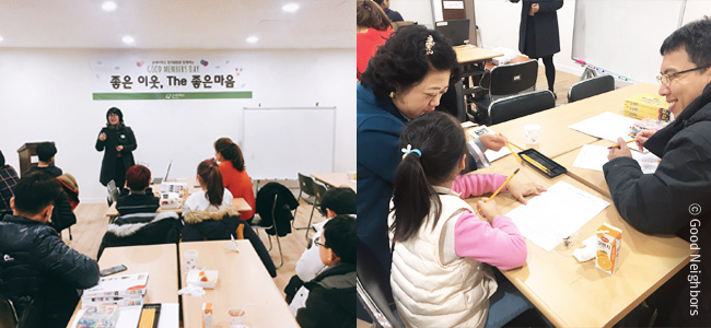 굿네이버스 좋은마음센터는 아이들을 위한 심리치료를 담당하고 있는 기관이예요! 이날 참여한 좋은 이웃에게 굿네이버스 좋은마음센터를 들어보신 적이 있으신지 물어보았습니다. 아직은 생소하게 다가온 좋은마음센터를 좋은 이웃들에게 소개하는 시간을 가졌어요. 좋은마음센터에 대한 사업소개를 들으신 한 회원님은 “굿네이버스가 이렇게 우리 주변에 있고, 지역에 아이들을 위해 운영되는 걸 알게 되어서 기쁘다.”라고 말씀 해주셨는데요, 지부 소개 시간을 통해 좋은마음센터에 대한 좋은 이웃들의 이해도가 한층 높아졌답니다.
