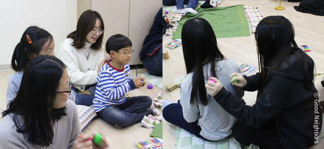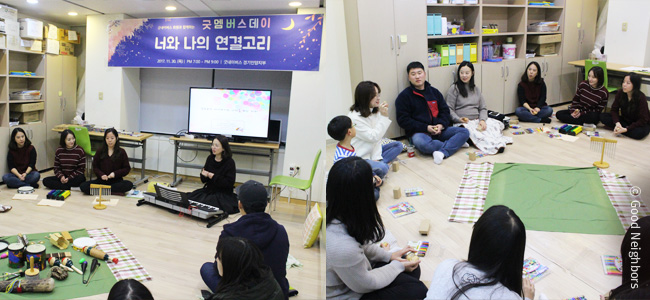 좋은 이웃들의 입장과 동시에 치료사와 직원들은 ‘선물할게’라는 제목의 노래로 첫만남의 어색한 분위기를 따뜻하게 만들었습니다:) 순서대로 자기소개를 하면서 자신에게 선물하고 싶은 것이 무엇인지 얘기했는데요. ‘선물할게’ 노래를 개사하여 서로에게 노래를 선물하는 시간으로 마음을 나누었답니다.