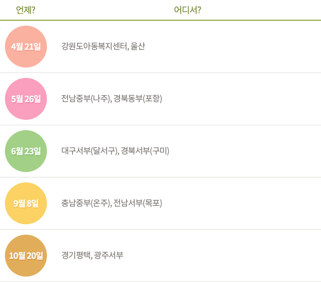 3월 29일 목요일. 올해 첫 모임은 굿네이버스 본부 라운지(영등포구), 대구서부지부(대구 달서구), 경북북부지부(안동)에서 진행됩니다. 신청은 매월 둘째 주부터 굿네이버스 홈페이지와 앱, 회원상담센터(☎1544-7944)를 통해 회원확인 후에 신청하실 수 있습니다. 3월에 만나요!
