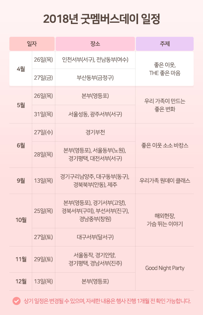 굿멤버스데이는 굿네이버스를 사랑하는 좋은 이웃들이 모여 전국에 있는 굿네이버스에 방문하여 따뜻한 나눔을 이야기하는 회원 모임입니다. 2018년 전국에서 진행되는 굿멤버스데이 일정을 확인하고 좋은 이웃이 살고 있는 우리 동네에서도 가깝게 굿네이버스를 만나보세요! 언제 어디서든 좋은 이웃이라는 이름으로 굿네이버스와 함께 좋은 변화를 만들어가는 회원님들을 만날 수 있기를 기대하며 기다릴게요!