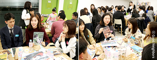후원하고 있는 굿네이버스는 어떤 기관인지, 무슨 사업을 수행하는지 많이 궁금하셨던 좋은 이웃들과 게임을 통해 재미있게 굿네이버스 사업을 알아보는 시간을 가졌어요. 또 회원님들이 어떻게 나눔을 시작하게 되었는지, 나눔을 실천한 소감을 함께 나누며 좋은 이웃과 더 가까워지는 시간도 가졌답니다. :)