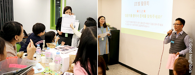 회원님들의 따뜻한 나눔 이야기를 들은 이후에는 굿네이버스는 어떤 기관인지, 어떤 사업을 수행하는지 게임을 통해 더 자세히 알아보는 시간을 가졌어요! 적극적으로 퀴즈에 답을 찾아보고, 앞에 나와 발표하는 회원님들의 굿네이버스를 향한 열정! 느껴지시나요? ^^