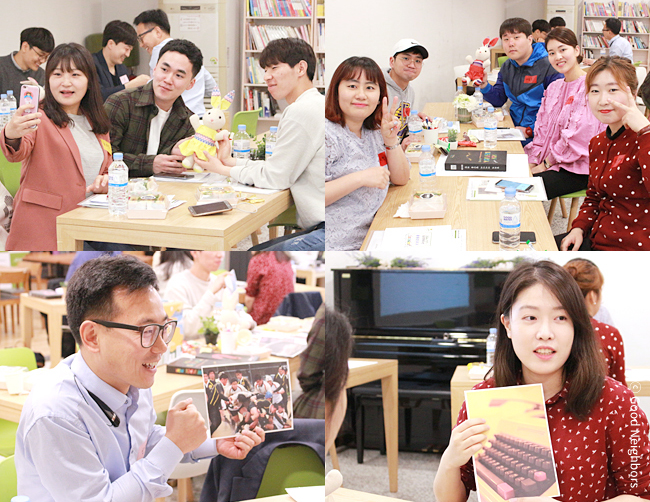 지금부터는 굿모닝 10기가 친해지는 시간! 한 해를 함께 할 조원들과 사진도 찍고 자기를 잘 표현할 수 있는 그림카드를 이용해 서로를 소개하는 시간을 가졌어요. 직업 군인부터 간호사, 학생까지 정말 다양한 굿모닝 10기! 처음 만났지만 조별로 금새 어색함을 잊고 활발하게 소통하는 모습을 보며 굿모닝 10기의 에너지 넘치는 활동을 더욱 기대하게 되었습니다.