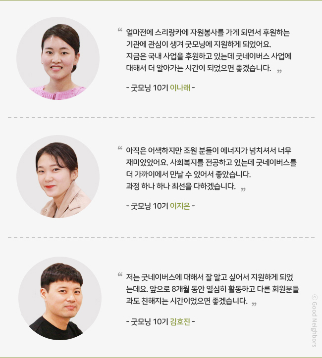굿모닝 10기와 함께 한 이번 오리엔테이션은 처음부터 끝까지 에너지가 넘치는 시간이었어요. 굿네이버스를 후원하는 수 많은 회원을 대표하여 활동할 굿모닝 10기! 세상을 위한 좋은 변화에 더 좋은 목소리를 담아줄 굿모닝 10기의 활약을 기대합니다. 굿모닝 10기 파이팅!