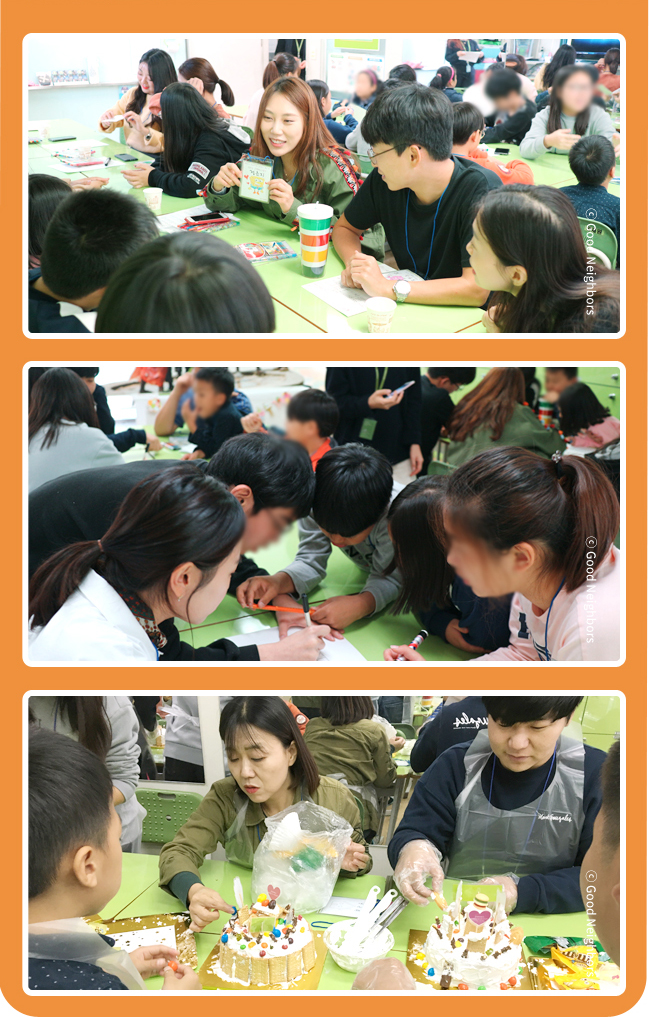 지역아동센터 아이들과 회원님들과의 첫 만남:) 본격적인 활동을 시작하기 전, 서로를 알아가기 위해 자기 소개를 하고 빙고게임을 하며 친해지는 시간을 가졌는데요^^ 옹기종기 모여 이야기하는 것만으로도 웃음이 가시지 않는 시간이었답니다. 그리고 대망의 케이크 만들기! 회원님과 아이가 짝이 되어 세상에 하나 뿐인 케이크을 만들고 함께 사진도 찍으면서 오늘을 추억하였습니다. 아이들과 회원님이 함께 만든 케이크! 맛있어 보이죠? :)