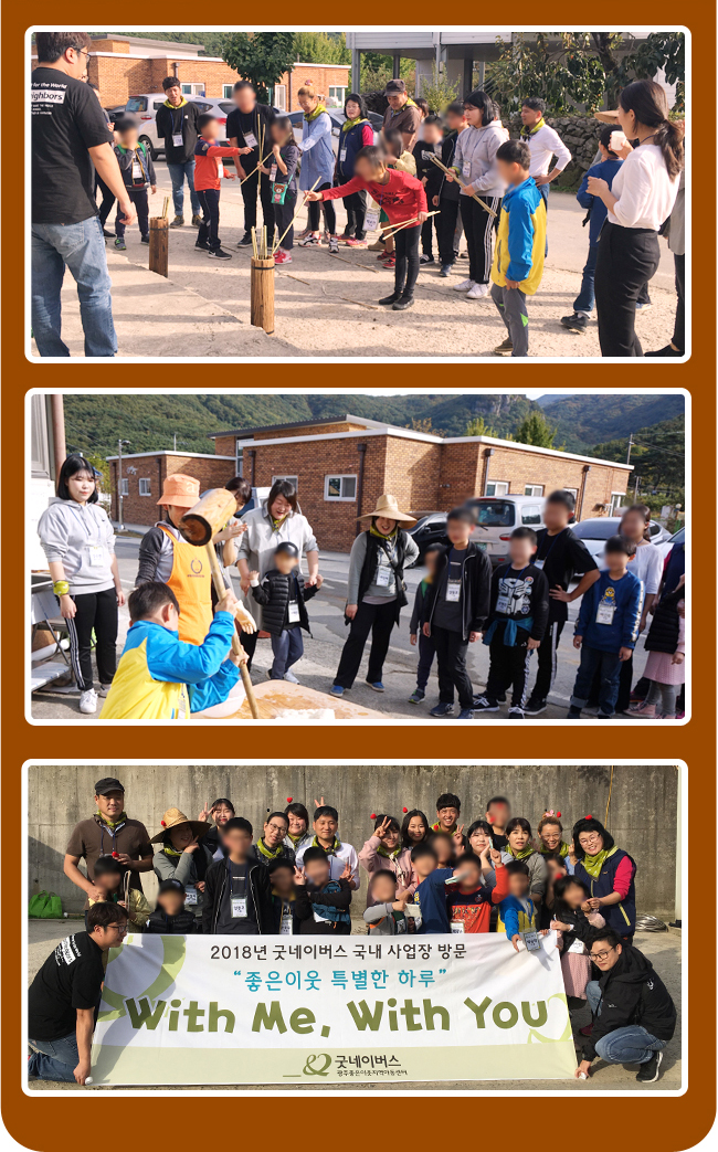 무등산 수박마을에서 함께한 회원님과 아이들의 특별한 하루! 회원과 아이가 한 팀이 되어 고구마 밭에서 가장 큰 고구마와 작은 고구마를 찾는 대회를 열기도 하고 직접 인절미 떡을 쳐보며 만들어 보는 시간도 가졌답니다. 그리고 긴장감 넘치는 민속놀이까지! 짧게만 느껴졌던 체험활동이 끝난 이후에는 서로 편지를 읽어주며 오늘을 기억하는 시간을 가졌는데요. “오랜만에 가슴이 뛰는 시간이 되었다.” 라는 한 회원님의 말처럼 굿네이버스도 더 많은 회원님의 가슴이 뛸 수 있도록 늘 함께하겠습니다:)