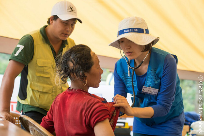 피해 주민들의 의료지원을 위해 원주세브란스기독병원(1진), 삼성서울병원(2진) 의료구호팀이 네팔로 파견되었습니다. 의료구호팀 1진은 고르카 시내에서 5시간 정도 떨어진 소띠 마을에 이동진료소 베이스캠프를 설치하고, 나흘 간 759명의 주민들을 대상으로 간단한 상처 소독부터 외상치료, 봉합수술, 약 처방 등 진료를 진행했습니다.