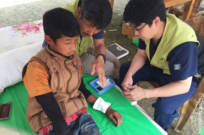 지진 당시 무너지는 집에서 가까스로 도망쳐 나오다 지붕에 왼쪽 손목을 베인 로샨 갈레는 열흘이 넘도록 상처를 치료하지 못하고 방치하다가, 소문을 듣고 아버지와 함께 이동진료소까지 네 시간을 걸어왔습니다. 아버지가 구호물품을 받으러 간 사이 로샨 갈레는 치료를 받았습니다.