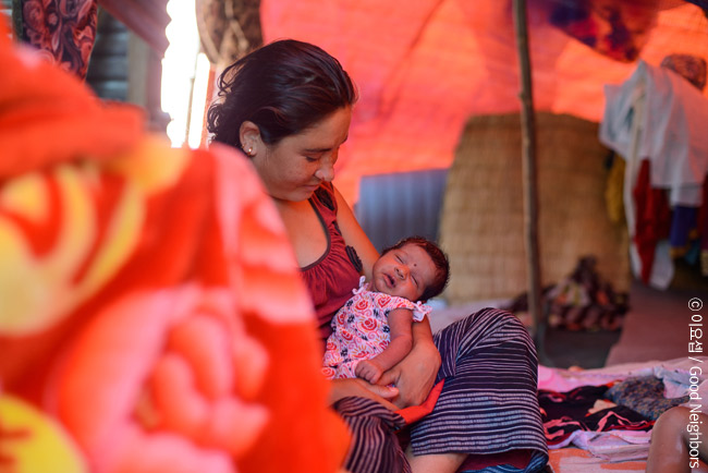 지진의 혼란 속에서도 생명은 태어났습니다. 집에서 설거지를 하고 있던 라티파는 갑작스런 지진에도 만삭인 탓에 재빨리 피할 수 없었습니다. 다행히 이웃의 도움으로 안전하게 대피할 수 있었는데요. 여진과 산사태를 피해 강변 공터에 있는 텐트에서 지낸 지 3일째 되던 날, 산기를 느꼈으나 지진으로 도로가 모두 막혀 이동이 쉽지 않았습니다. 공터에서 함께 지내던 이웃들이 힘을 모아 들것에 라티파를 눕히고 세시간 넘는 길을 걸었습니다. 도착한 아루갓에서 간호사를 만났지만 그곳에서도 밖에서 아이를 낳아야 하는 환경이었습니다.