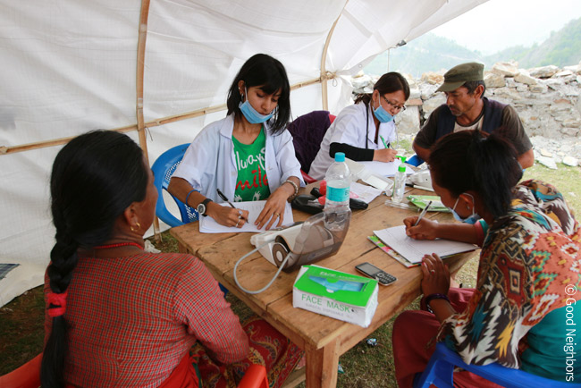 네팔 긴급구호 현장에서는 의료구호팀의 활약이 빛났습니다. 2010년 아이티 지진 긴급구호에 이어 이번에도 굿네이버스와 함께한 원주 세브란스 기독병원 의료구호팀. 그리고 이번 긴급구호를 시작으로 새롭게 함께한 삼성서울병원 의료구호팀. 그들은 가장 도움의 손길이 필요한 지역에서 몸이 아픈 아동과 지역주민을 만났습니다. 진료소에서 가까운 마을뿐 아니라 3~4시간을 걸어온 다른 마을 사람들로 이동진료소는 늘 인산인해를 이뤘습니다. 의료구호팀은 길게 늘어선 줄이 모두 없어질 때까지 종일 진료를 한 뒤, 잠을 줄여가며 평가 회의를 하고 다음 의료진들에게 전달할 의료 구호품 현황을 체크했습니다. 파견된 한국인 의료구호팀 외 현지 의료인력 또한 이동진료소에서 함께하며 의료구호 활동에 최선을 다했습니다.