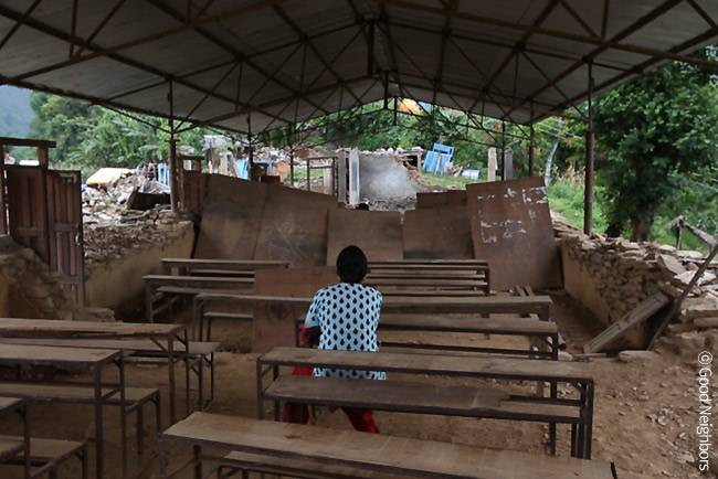 ▲ 무너진 학교 교실에 앉아 있는 아동의 뒷모습