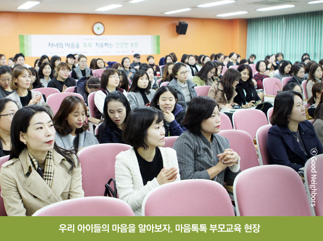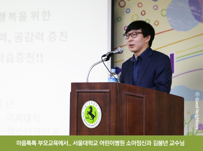 11월의 어느 날, 서울 마장초등학교에서 특별한 강의가 열렸습니다. ‘자녀의 마음을 톡톡(Talk Talk) 치유하는 건강한 부모’라는 주제로 서울대학교 어린이병원 소아정신과 김붕년 교수님의 강의가 있었는데요. 우리 아이들의 마음을 더 이해하고 건강한 마음 성장을 위한 양육 방법을 들으려는 어머니들로 강당이 꽉 채워졌습니다. 교수님의 열띤 강의 내용을 일부 소개합니다.