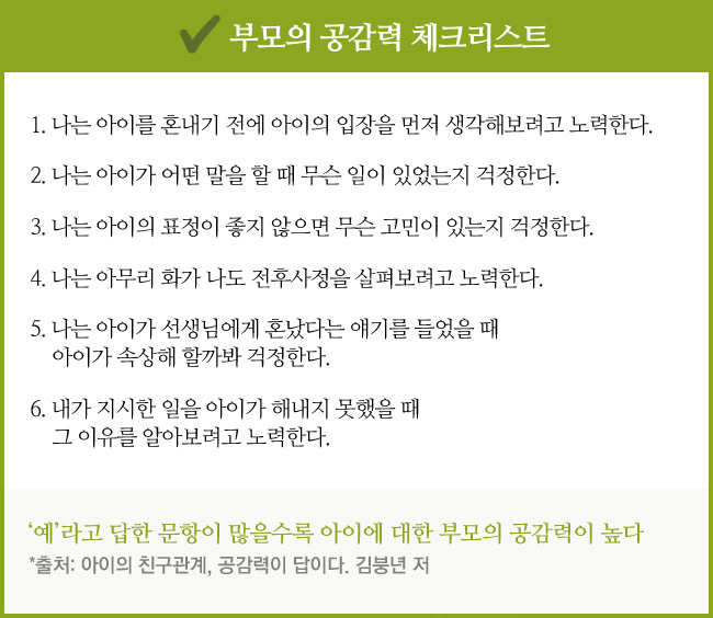 공감력은 애착력과 조절력이 만들어지면 사실 자연스럽게 형성되는데요. 문제는 그런 능력이 적절하게 만들어지지 못한 아이들이 생각보다 많다는 거지요. 그렇지만 공감력도 가르칠 수 있답니다. 다만 시간이 좀 더 걸릴 뿐입니다. 공감력의 핵심은 부모와 아이와의 감정적 교류인데요. 공감력 높은 부모의 특징을 몇 가지 정리해보았습니다.