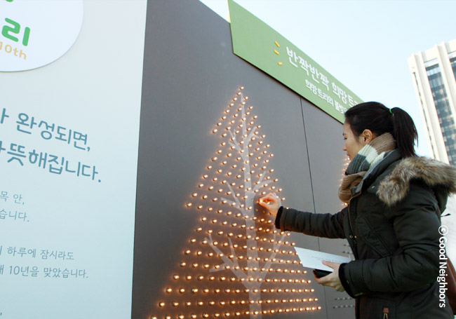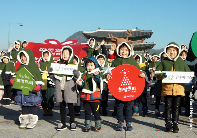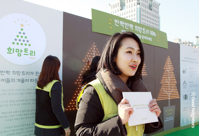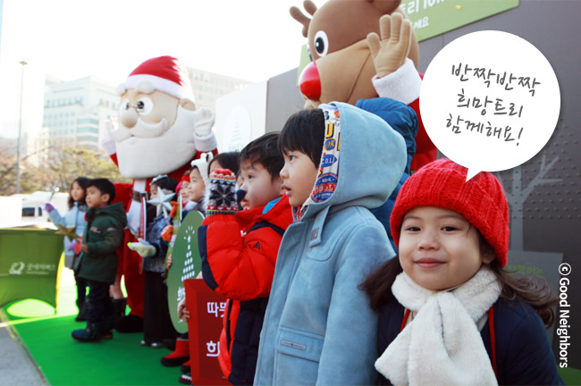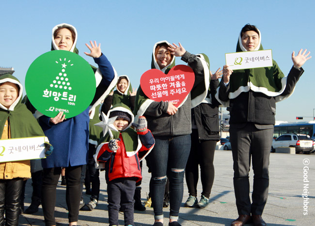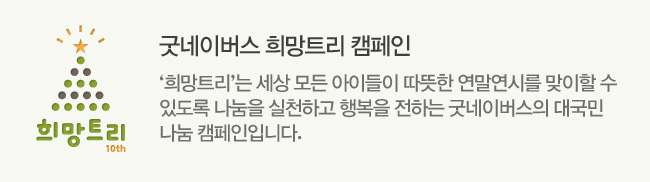 겨울이면 더욱 춥고 움츠러드는 아이들, 배보다 사랑이 고픈 아이들에게 온기를 전하기 위해 시작한 희망트리. 좋은 이웃의 관심으로 10년간 지속된 희망트리는 매년 겨울 아이들에게 희망이 되어 전해졌습니다. 올해도 희망트리는 반짝반짝 빛나길 기다리고 있는데요. 희망트리에 불이 켜지면 우리아이들의 어두운 겨울이 밝아지고, 우리 아이들의 추운 겨울이 따뜻해집니다. 그리고 우리의 마음은 더더욱 따뜻해 질 것입니다.