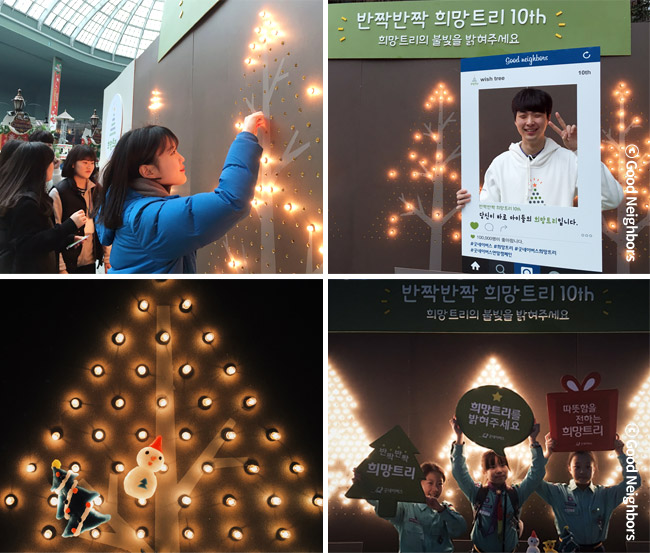 12월 8일부터 30일까지 롯데월드와 롯데시네마(합정점, 김포점, 서울대입구점)에서 희망트리 캠페인 부스를 만날 수 있습니다. 캠페인 부스에서는 희망트리 키트도 구입하고, 직접 전구의 불을 밝힐 수도 있는데요. 캠페인 부스 참여 모습을 희망트리 프레임을 이용해 인증샷을 찍고 SNS에 업로드하면 다양한 선물도 받을 수 있답니다. 길에서 희망트리 부스를 만나면 절대 그냥 지나치치 마세요!