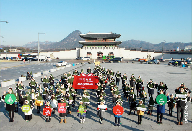 바로 초대형 ‘인간트리’를 연출하는 것이었는데요. 이날 참여한 100여 명의 시민들은 어려운 환경에 놓인 아이들의 따뜻한 겨울을 응원하는 마음을 담아 대형 인간 희망트리를 완성하는 이색 퍼포먼스를 펼쳤습니다.