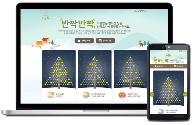 2015 굿네이버스 희망트리 페이지에 방문하시면 불을 밝힐 수 있는 3개의 희망트리 카드를 만날 수 있습니다. 아이들의 새학기가 움츠러들지 않도록 응원하는 ‘꿈이 자라는 희망트리’, 겨울방학이 되면 더 배고픈 아이들을 위한 ‘따뜻한 밥 한끼를 전하는 희망트리’, 난방비 부족으로 더 추운 겨울을 보내야 하는 아이들을 위한 ‘꽁꽁 언 손을 녹이는 희망트리’가 그것인데요. 이 중 하나의 트리에 불을 밝히고, SNS에 로그인 한 후 응원의 메시지나 소원을 적으면 불빛은 아이들에게 희망이 되어 전해집니다.