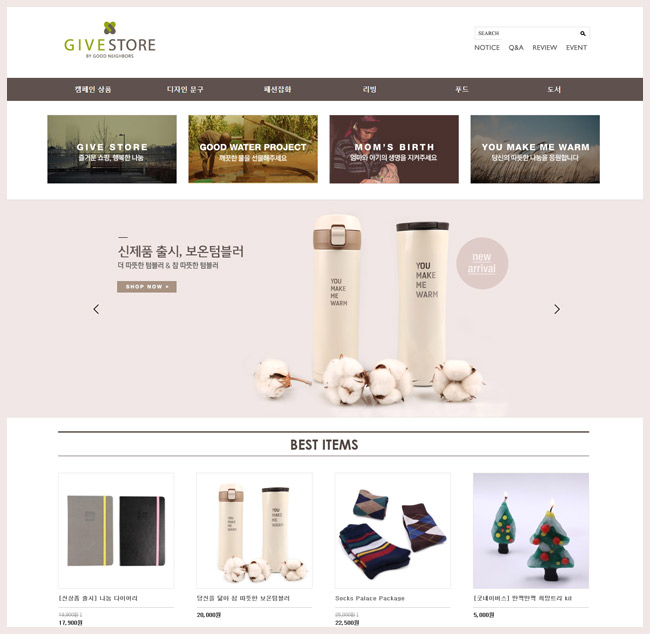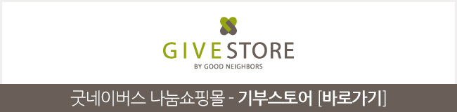 굿네이버스는 나눔 쇼핑몰 기부스토어(http://givestore.kr)를 통해 품질 좋은 디자인 소품들을 합리적인 가격에 판매하고 있습니다. 수익금은 전액 국내외 소외된 이웃들을 위해 사용됩니다. 상품 구매만으로 일상에서 자연스럽게 나눔을 실천할 수 있는 것이지요.