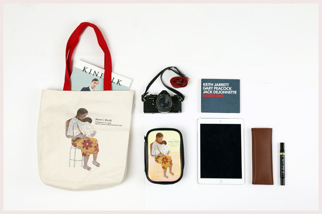 열악한 출산 환경으로 아이를 낳는 것이 두려운 아프리카 말라위의 산모들. 그 두려움과 고통을 설렘과 기쁨으로 바꿔주고 싶은 마음을 담았습니다. 말라위의 엄마와 아이의 모습이 그려진 '엄마의 탄생' 에코백과 파우치입니다.