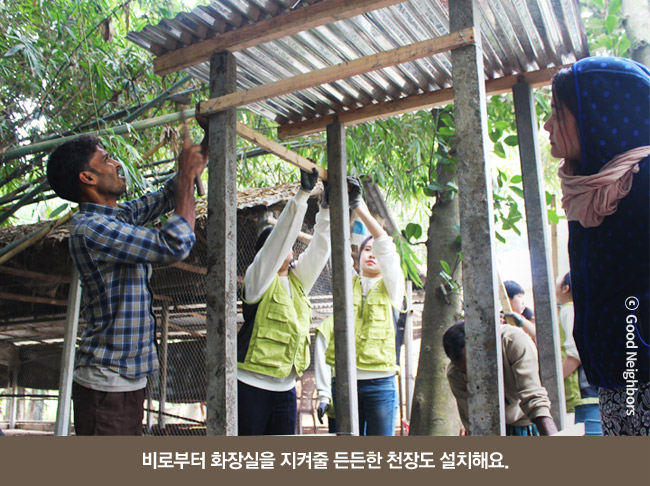 마지막 일정으로 청소년 희망봉사단은 시라지 간지 사업장 근처 마을에 총 4개의 화장실을 설치했어요. 화장실 설치 전 방글라데시 가정집을 방문했던 학생들은, 화장실의 위생상태가 좋지 않음은 물론 화장실에는 지붕도 문도 없다는 것을 발견했어요. 그래서 마을에 지붕도 문도 있는 깨끗하고 안전한 화장실을 설치하기로 했답니다.