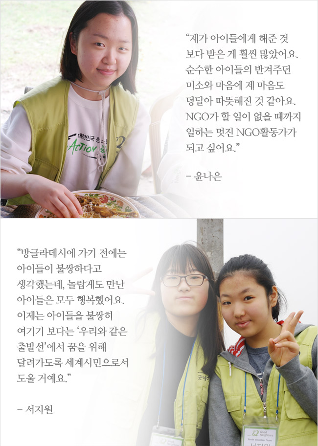 지난해 겨울, 서류심사, 면접을 거쳐 20명의 학생들이 ‘2016년 청소년 희망봉사단’으로 선발되었어요. 선발된 학생들은 지난 1월 방글라데시 아동의 권리를 지키기 위해 굿네이버스 방글라데시 지부로 떠났답니다. 방글라데시에서 아이들을 가르치고, 화장실을 세우는 등 3박 4일 간의 뜻깊은 시간을 보냈는데요. 그 특별했던 여정, 함께 떠나보실까요~?
