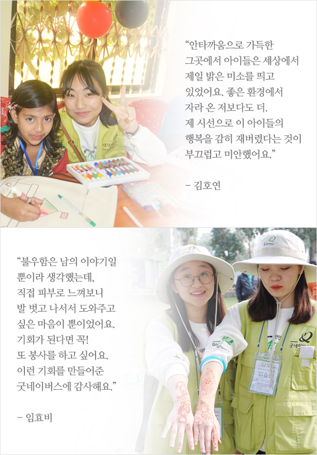 어린 나이에도 불구하고 지구촌 아이들이 보다 나은 세상을 누릴 수 있도록 앞장서는 학생들이 있는데요, 바로 ‘굿네이버스 청소년 희망봉사단’ 이랍니다. ‘청소년 희망봉사단’은 굿네이버스의 다양한 해외아동교육지원 활동에 참여해 글로벌시민의식을 갖추고, 지구촌 문제를 해결하는 굿네이버스의 대표 청소년 봉사단이에요.