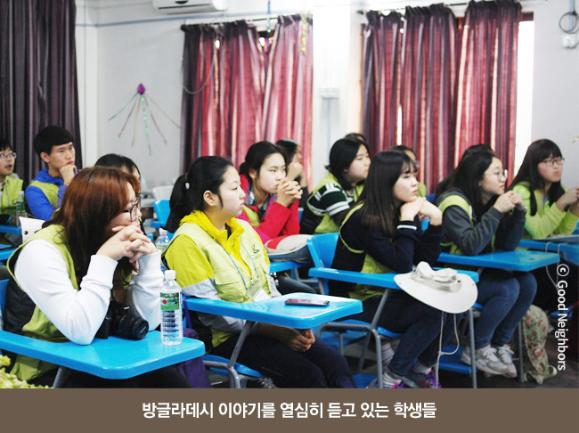 방글라데시에 도착한 청소년 희망봉사단은 우선 시라지 간지 사업장을 방문해 방글라데시 현지 상황을 알아보는 시간을 가졌어요. 김정석 굿네이버스 방글라데시 지부장과 현지 직원들의 강의를 통해 인터넷에서도, 책에서도 볼 수 없었던 방글라데시의 이야기를 속속들이 알 수 있었습니다.