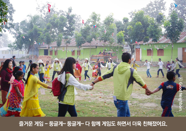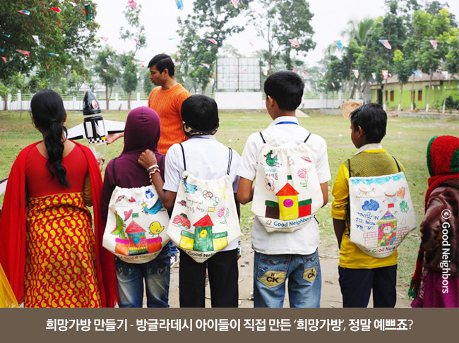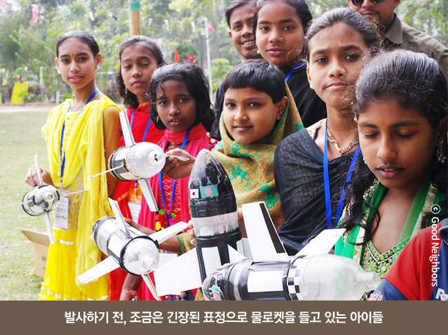 이튿날, 청소년 희망봉사단은 ‘희망가방 만들기’, ‘물로켓 쏘기’ 등 다양한 교육 프로그램을 통해 방글라데시 아이들과 어울리는 시간을 가졌어요. 청소년 희망봉사단 학생들이 직접 프로그램 하나하나를 기획하고 준비했기에 더 특별했답니다. 열심히 준비한 만큼 방글라데시 아이들도 즐겁게 참여해 주었어요!