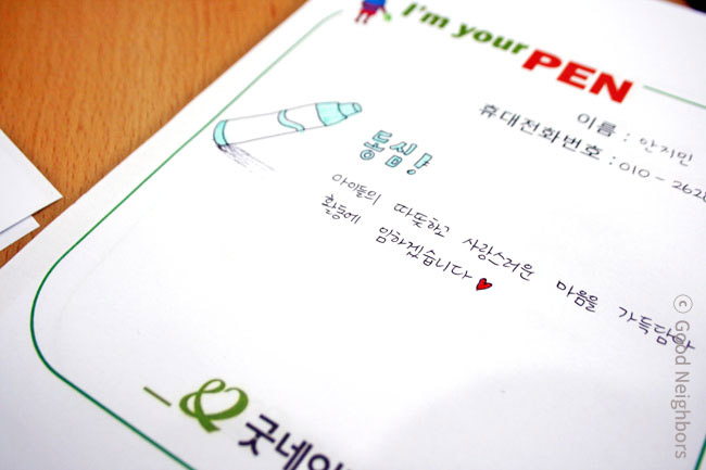 I’m your PEN은 굿네이버스 회원님이 아동에게 보내는 소중한 편지와 결연아동들의 회원님께 보내는 감사 편지를 번역하는 번역자원봉사모임입니다.