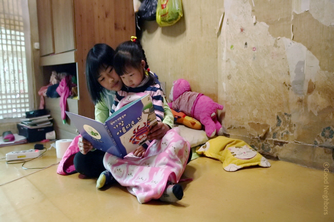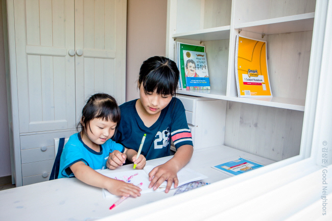 ▲좋은 이웃의 나눔으로 새 집과 새 책상을 선물받고 행복해하는 다은이와 동생
