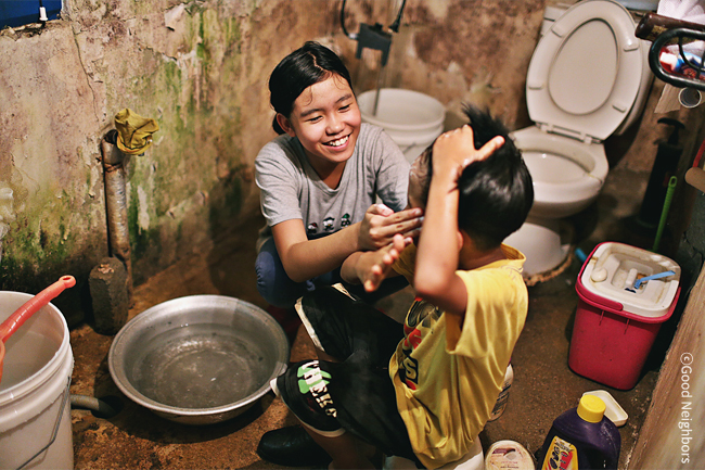 아침밥을 준비하고 동생들을 씻기며 하루를 시작했던, 13살이라고 하기엔 너무나 의젓한 민아(가명). 단열과 통풍이 잘 되지 않는 부엌에서 밥을 짓다 보면 금세 이마엔 송골송골 구슬땀이 맺혔습니다. 곰팡이가 가득해 퀴퀴한 욕실은 뜨거운 물이 나오지 않아 물을 끓여다 동생들을 씻기곤 했습니다.
